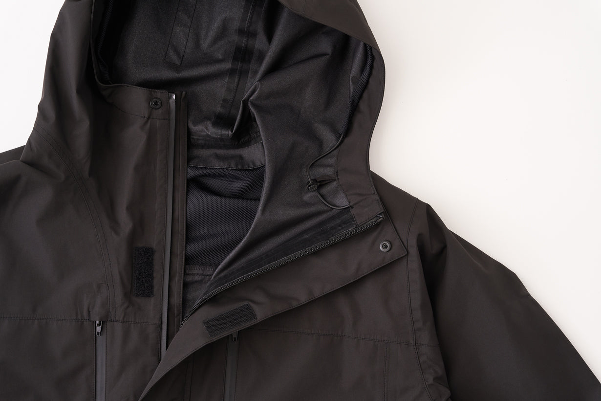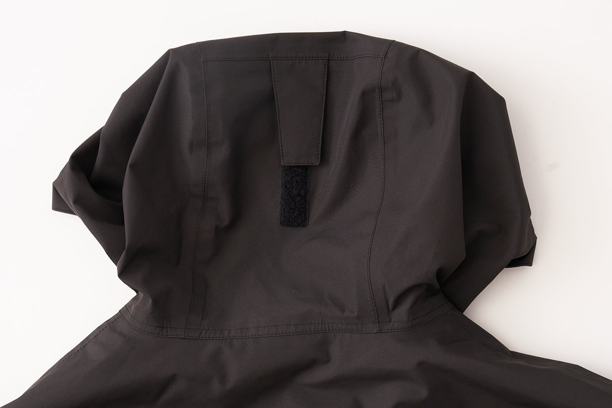 フードはツバを長めにし、ドローコードを絞って調整可能なだけでなく、視界が悪くならないように頭頂部のフードアジャスター(ベロクロ)で調整可能です。